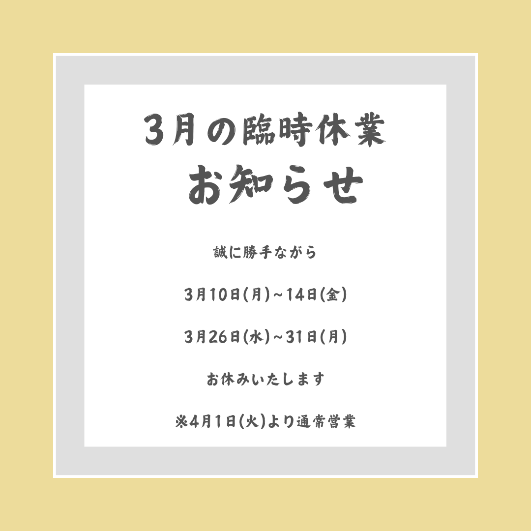 3月は臨時休業日が多くご不便おかけ致しますが、皆様のお越しをお待ちしております。