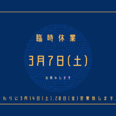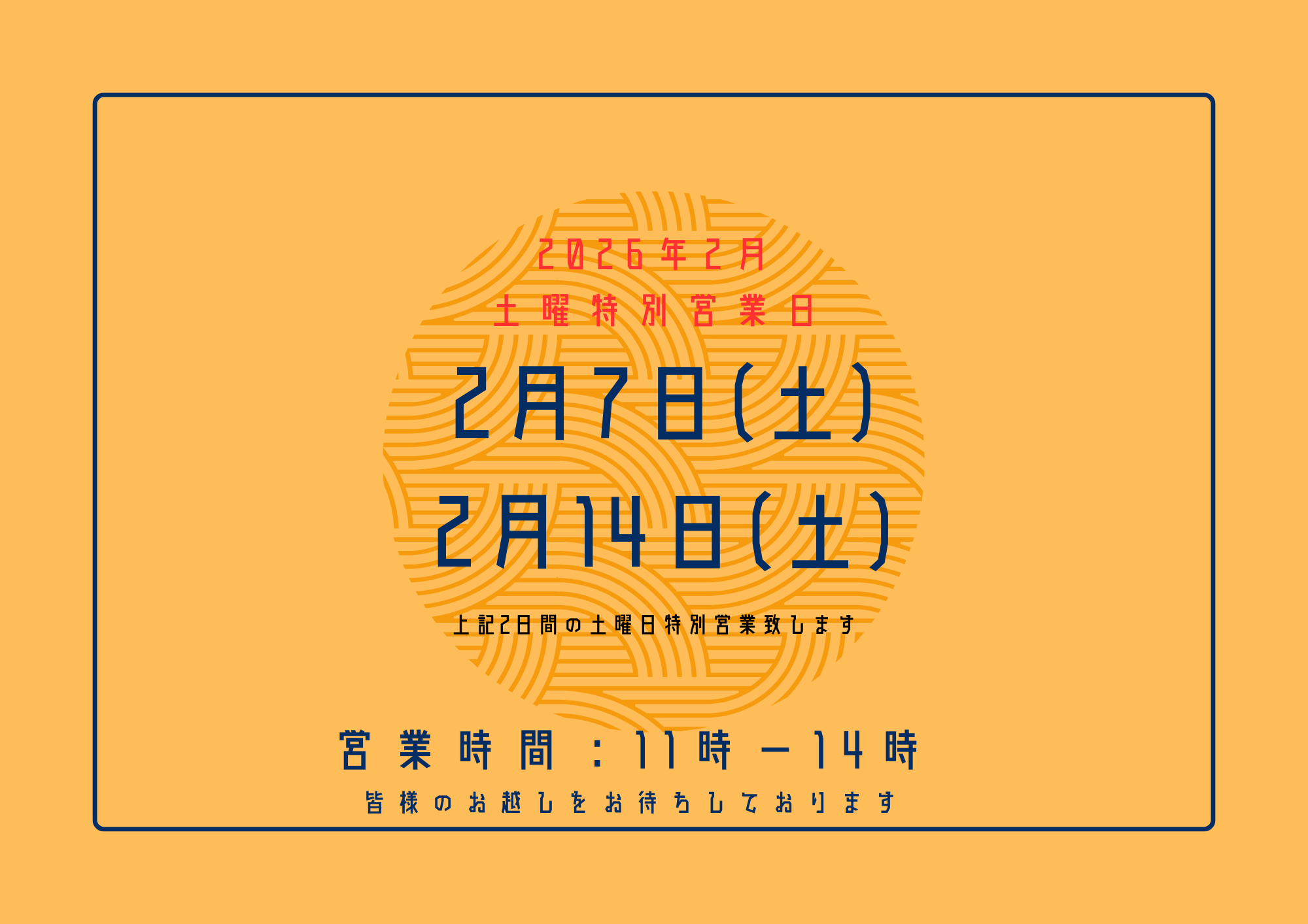 2026年2月土曜特別営業日 2026.01.24 【2月7日(土)/2月14日(土)】 上記2日間の土曜日11時~14時、営業致します。 Tweet Share Hatena Pocket RSS feedly Pin it